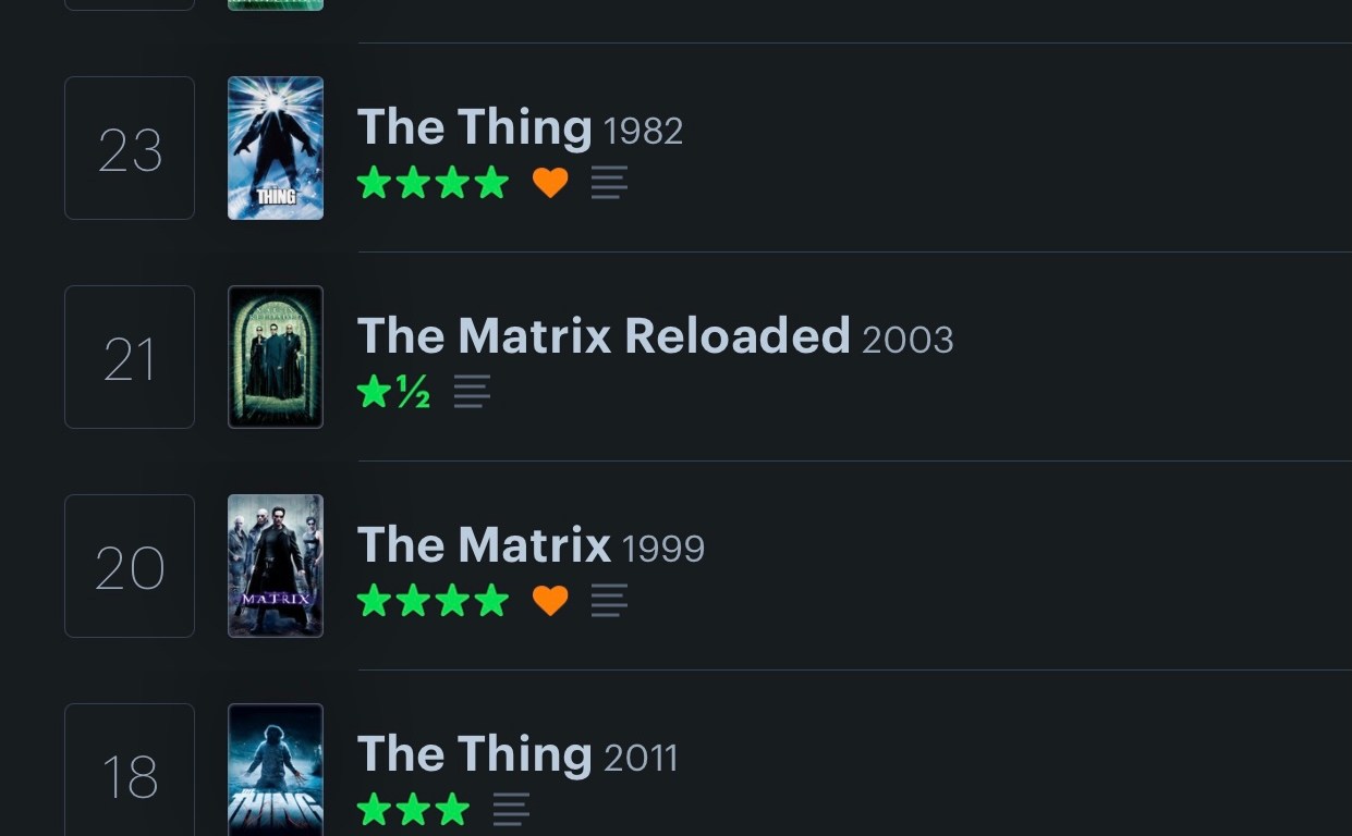 The Thing… should be higher. And likely would have been if not for one thing: despite never having actually sat and watched it, I knew everything that happened. I knew the end scene. I knew the defibrillator machine bit. I knew the blood test part. If I had managed to go in blind to a 40 year old movie, that would have been ideal, but as it was, I was sitting thinking “Oh, this is going to be the scene where [X] happens”. It’s still good. But I imagine seeing it unspoiled would be best.