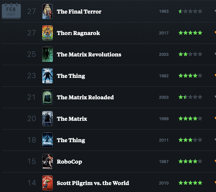 There are two fives in that lot, but neither is anything brand new. I’ve seen both Scott Pilgrim and Ragnarok before. I did bump Ragnarok up to a 5/5 from a 4.5, though; it’s so enjoyable and rewatchable.