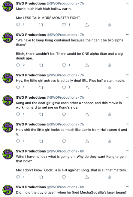I… yes. Obviously Shawshank is better. But that doesn’t detract from the fact that Godzilla vs Kong is successful. It could have looked bad, but it didn’t. It could have been boring, but it wasn’t. It could have cheaped out on the monster fights and made the podcast subplot take up more time, but it didn’t. Additionally, it’s only 113 minutes! They could have padded the hell out of this thing, but they kept it slim and trim. As I said at the top: I can’t be mad at a movie that says “this is what we want to give you” and then proceeds to give it to us in a well-executed manner.