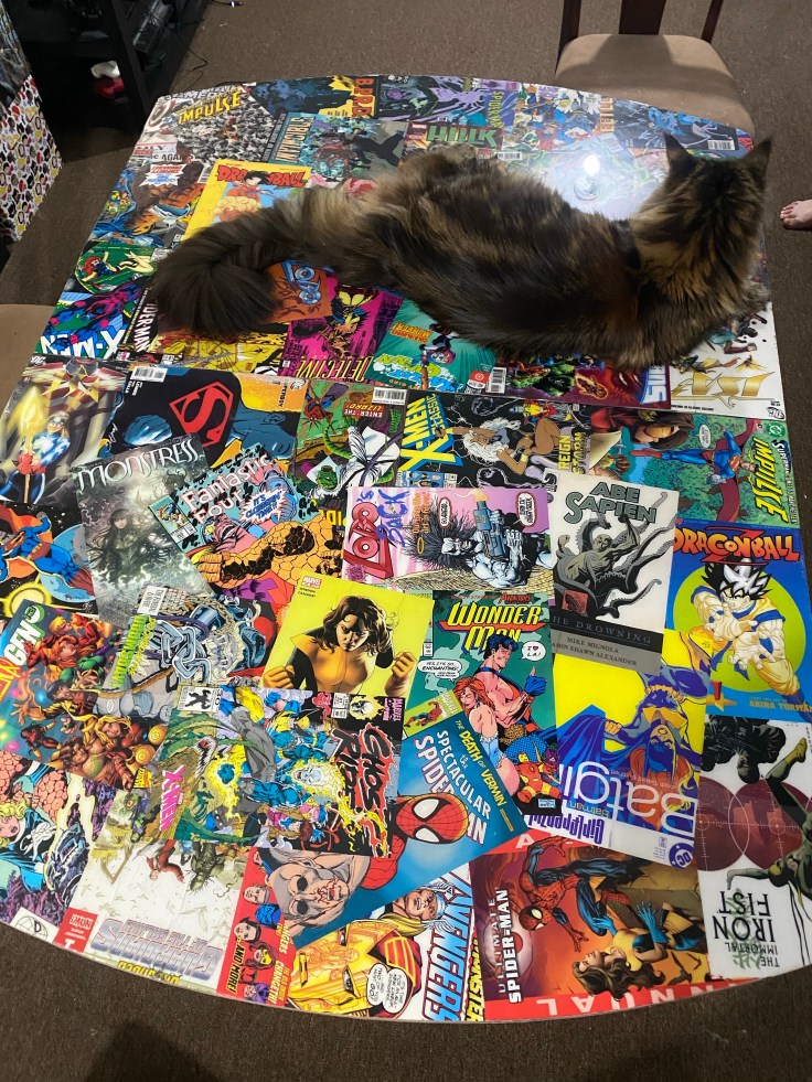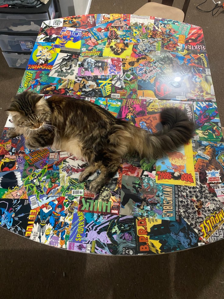 We re-purposed our old kitchen table into a super snazzy gaming table of (wait, I always forget this word) decoupaged comic book covers!