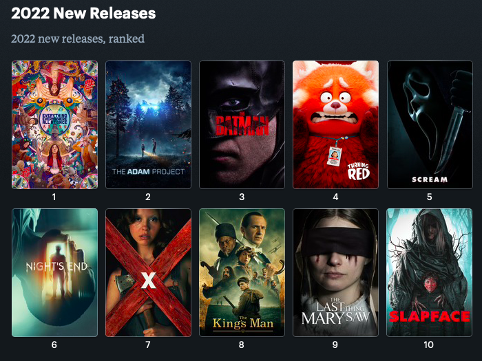 Anyway, yeah… I was a fan of this film. I haven’t seen a ton yet, but it’s easily the best movie of all the 2022 new releases I’ve seen so far (as the image above shows). Will it be #1 by year’s end? Well, the Into The Spiderverse sequel comes out this winter, so let’s pump the breaks on that. But it could well be my #1 going into December.
