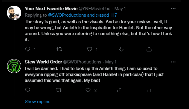 Anyway, I was wrong in a movie critique recently. Upon watching and reviewing the new Robert Eggers film The Northman on Letterboxd, I gave it 1.5 stars out of 5, and most of my review was lambasting the flick for being an absurd rip-off of Hamlet. The character is on a misguided quest to avenge his father, who was murdered by his uncle! The character’s name is friggin’ AMLETH, for god’s sake! What tripe, right?