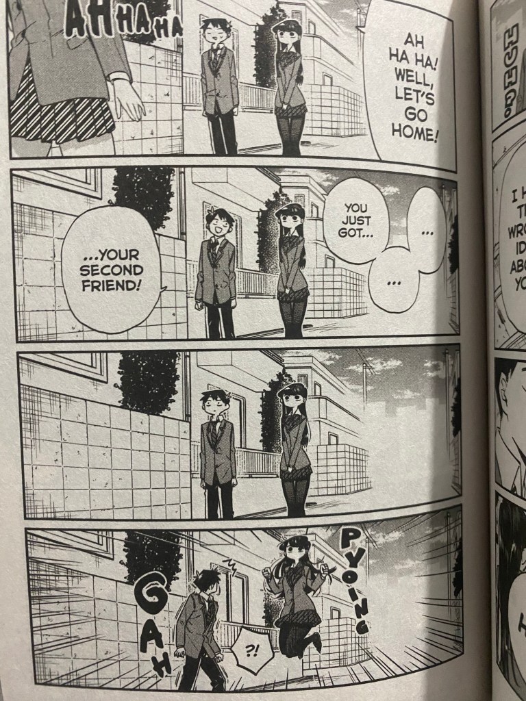 Their conversation ends with Komi admitting her life dream is to have 100 friends, and Tadano vowing to make that come true. So that’s it: that’s the premise for Komi Can’t Communicate: Can Tadano help her make 100 friends? Or, at least, enough to make her happy and able to talk to people. Whichever! I don’t want to have to keep track of 100 characters, book.
