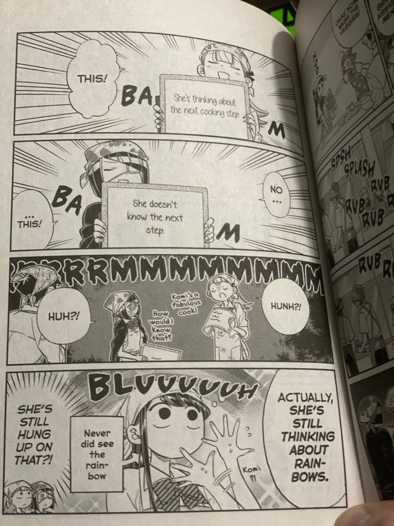 We got an odd pairing to start off this volume, with Nakanaka (the girl stuck in a role-playing phase trying to create an identity, remember? With the “dragon force”?) inviting Komi to hang out at her house. Actually? You know what? I lied. We HAVE seen these two together before, maybe it’s not so unusual: when Komi befriended Nakanaka in gym class because no one wanted to partner up with the latter.
