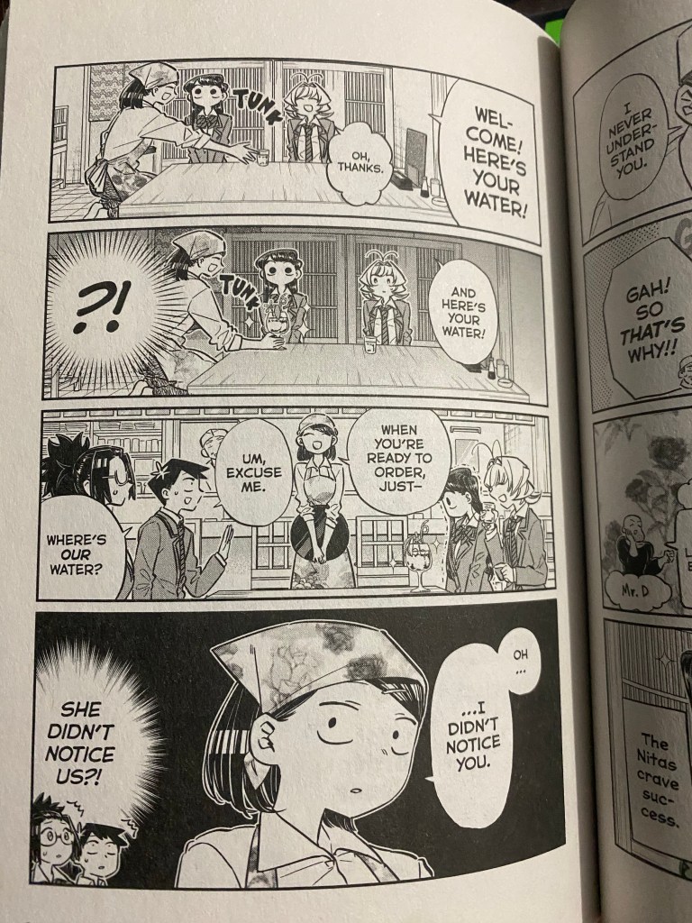 We then get ANOTHER chapter about Agari taking everyone out to eat. Okay, we already did this once in the first four volumes, but… sure. They end up finding a run-down place Agari has never visited before. The server is convinced Komi is a local secret restaurant reviewer, so she treats Komi wonderfully but ignores everyone else.