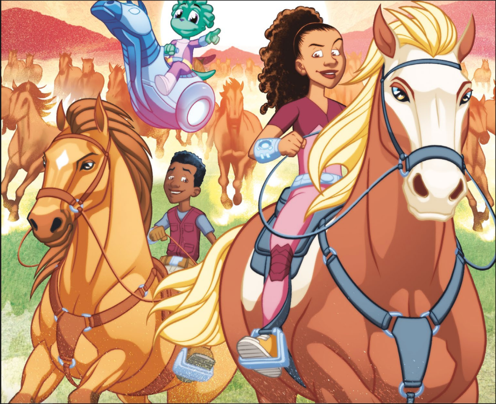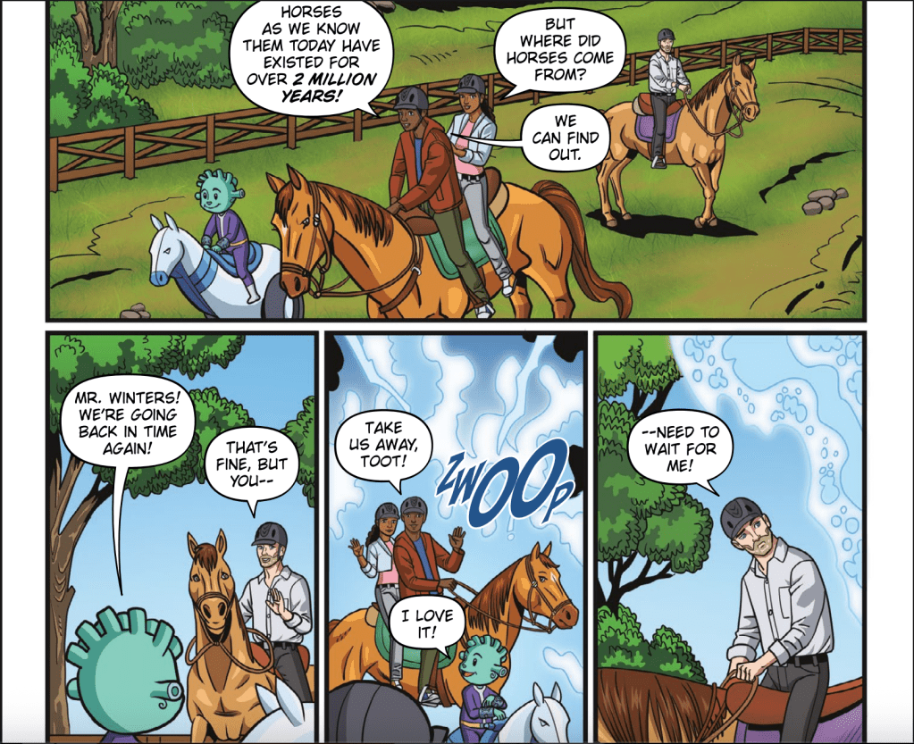 Today’s book is more of an educational venture than an action-packed one. As noted in the publisher’s quote above, Secret STEAM Society: Horses is very much like an extensive episode of Magic School Bus. It’s a lesson on everything you could ever want to know about horses.